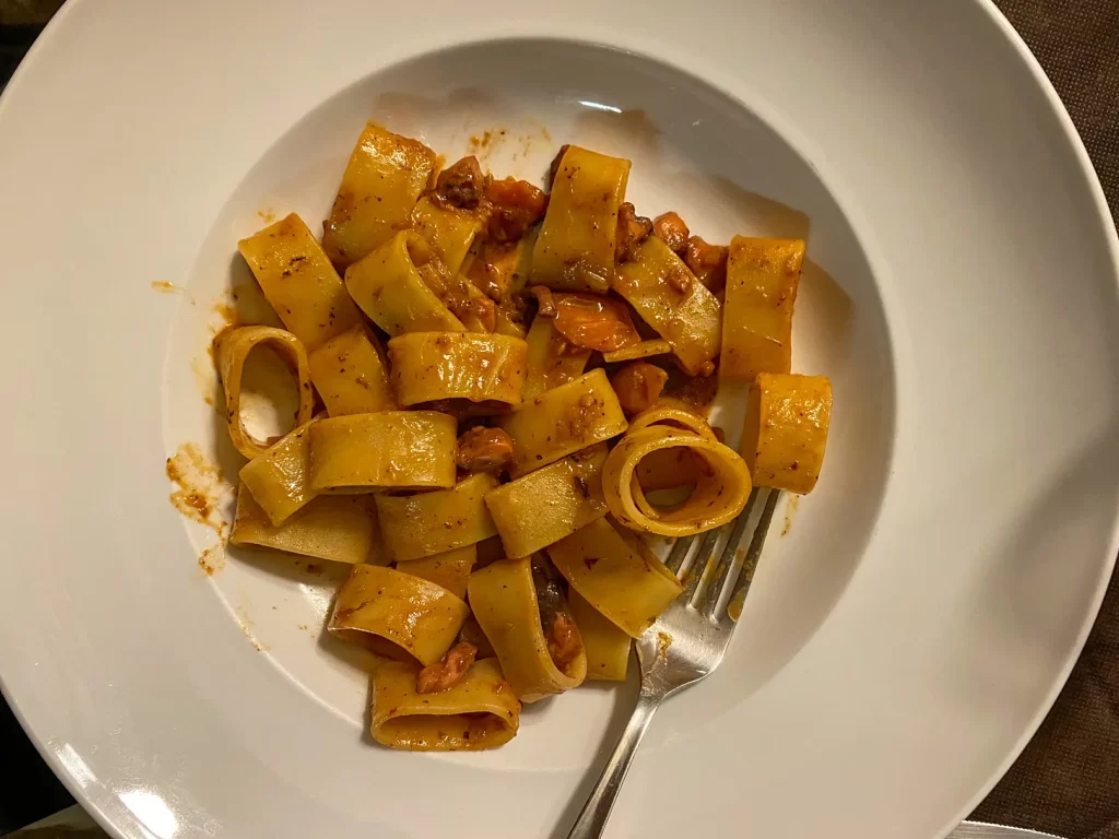 It’s very rare that I forget to take a photograph of what I’m eating before I start. But when this plate of wonder was set in front of me, and I got even a little smell of what was to come, my fingers went to my fork first before my phone. Calamarata pasta (slightly narrower than paccheri, but more or less the same concept) with octopus ragù and nduja sauce. The pasta was perfectly al dente – slightly chewy without being crunchy, with the sauce perfectly enhancing the octopus meat without overpowering it. All three of us who had ordered the same dish were in heaven. I had initially asked when ordering for some extra chili to be brought to the table – but it was absolutely unnecessary. Anything stronger would have been overdoing it – and this was a master of balance.