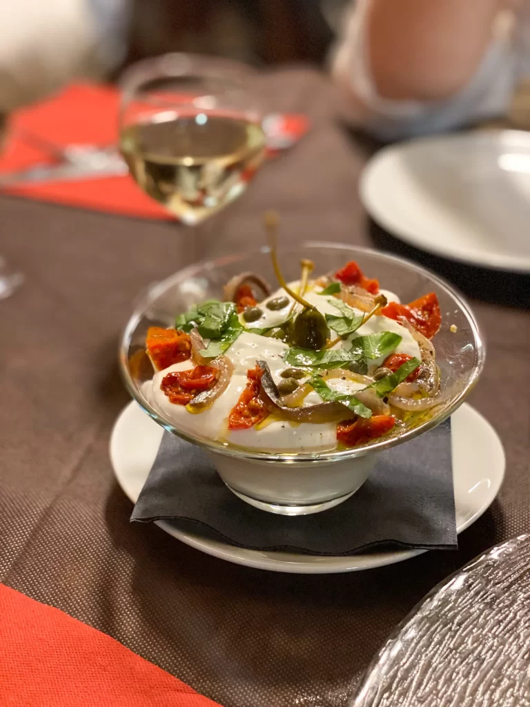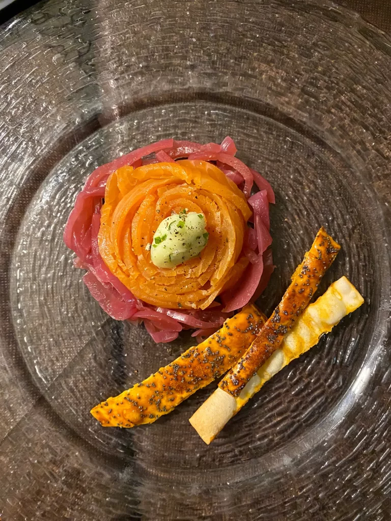 The second starter took a little side step away from Italian cuisine, showcasing gorgeous layers of smoked salmon surrounded by a ring of Tropea onion cooked in saor — a typical Venetian sweet and sour sauce. On top, a salted butter cream, and some crackers on the side. The star here was absolutely the onions, who between four forks certainly ran out a little too fast. Despite its surprising presence on this menu, it was another refreshing addition to the evening.