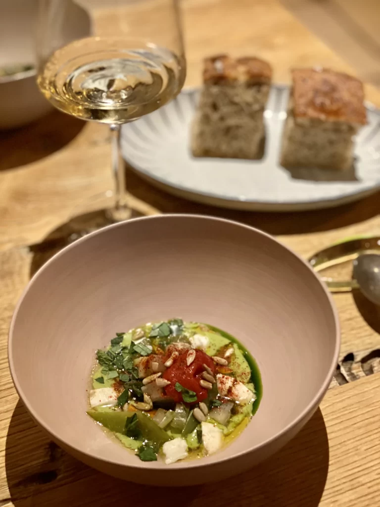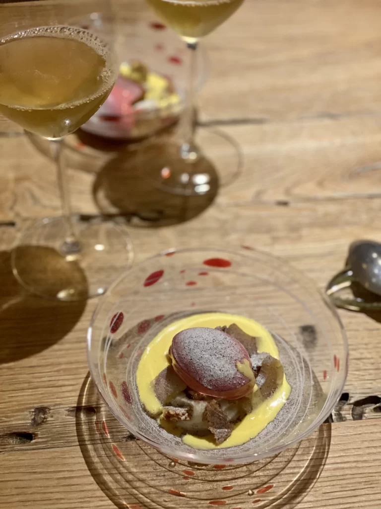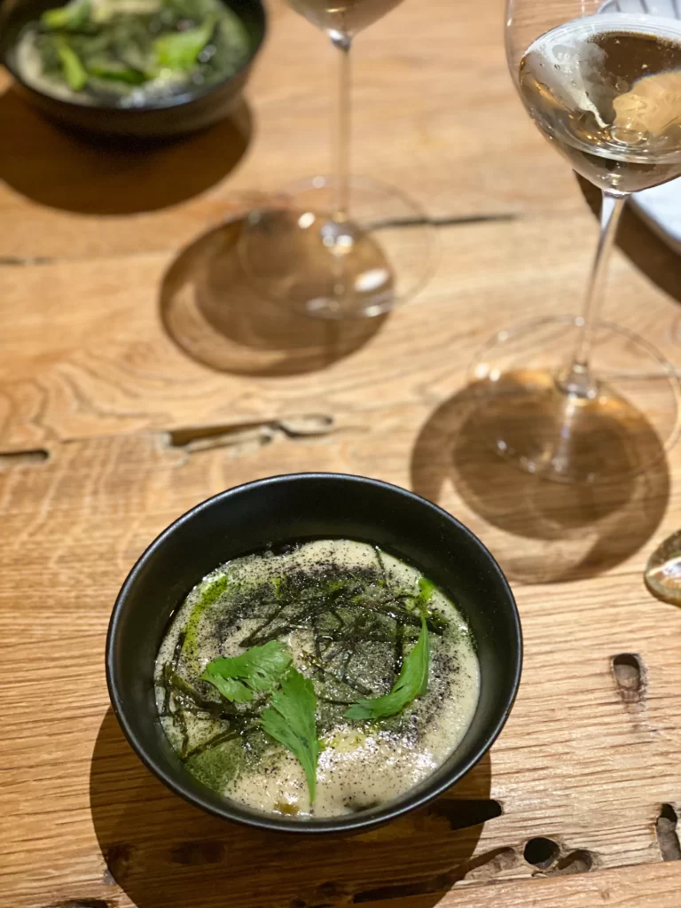 Dès ce début de repas, l’influence asiatique dans la cuisine est claire. À côté, nous avons aussi un des meilleurs pains que j’ai pu goûter dans ma vie (pardon, Poilâne) : spongieux mais pas sec grâce à son huile d’olive, et parfaitement assaisonné. Nous l’avons partagé en un maximum de morceaux en espérant qu’il puisse durer le plus longtemps possible. Même si le prosecco n’a rien ajouté à notre compréhension de l’assiette, il contribue à un début d’expérience rafraîchissant avec son palais de pomme verte acide.