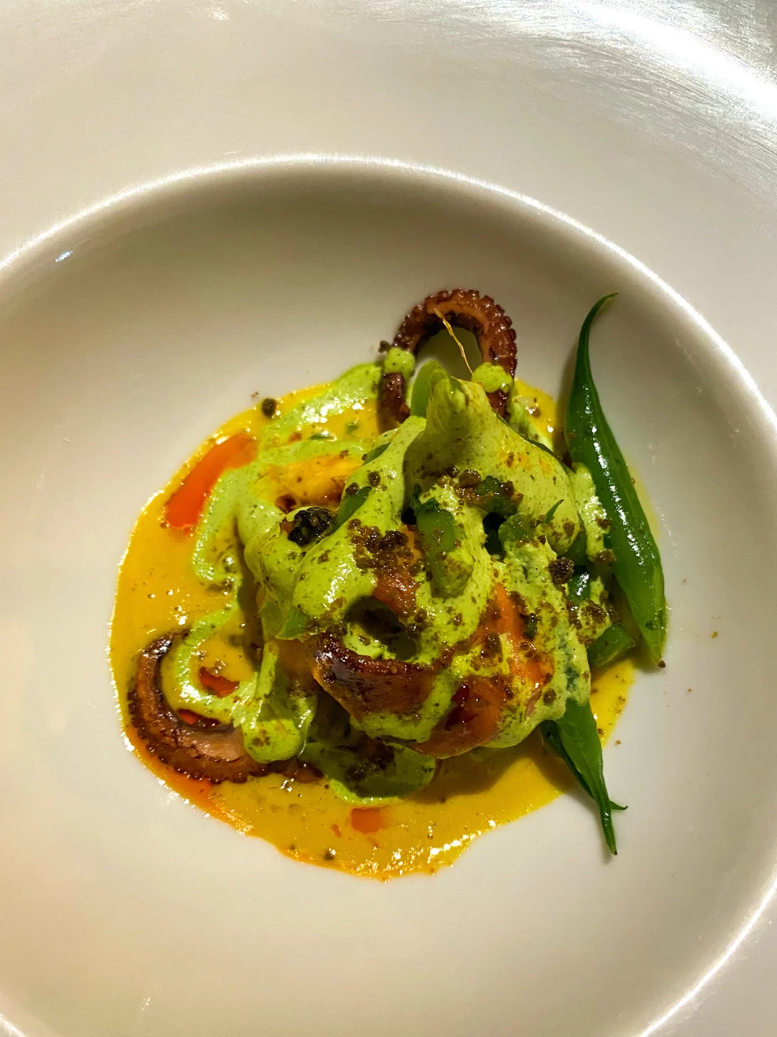 L’assiette arrive : laksa, poulpe et haricots verts. Le corps du curry accompagné par le poulpe au goût légèrement marin, crée un équilibre semblable à une assiette terre-mer.