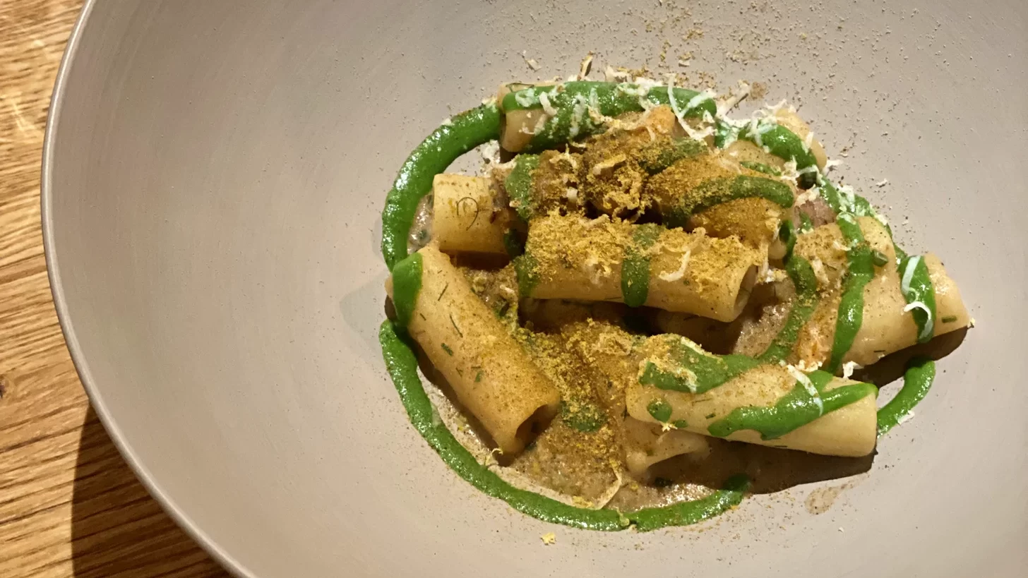 Ensuite, le ‘moules-bushi’ est réduit en poudre et parsemé au-dessus des rigatoni, flageolets et moules. Le Garganega nous a suivi jusqu’à ce plat, et même s’il n’était pas aussi ‘wow’ qu’avec l’assiette précédente, il a tout de même établi une bonne balance.