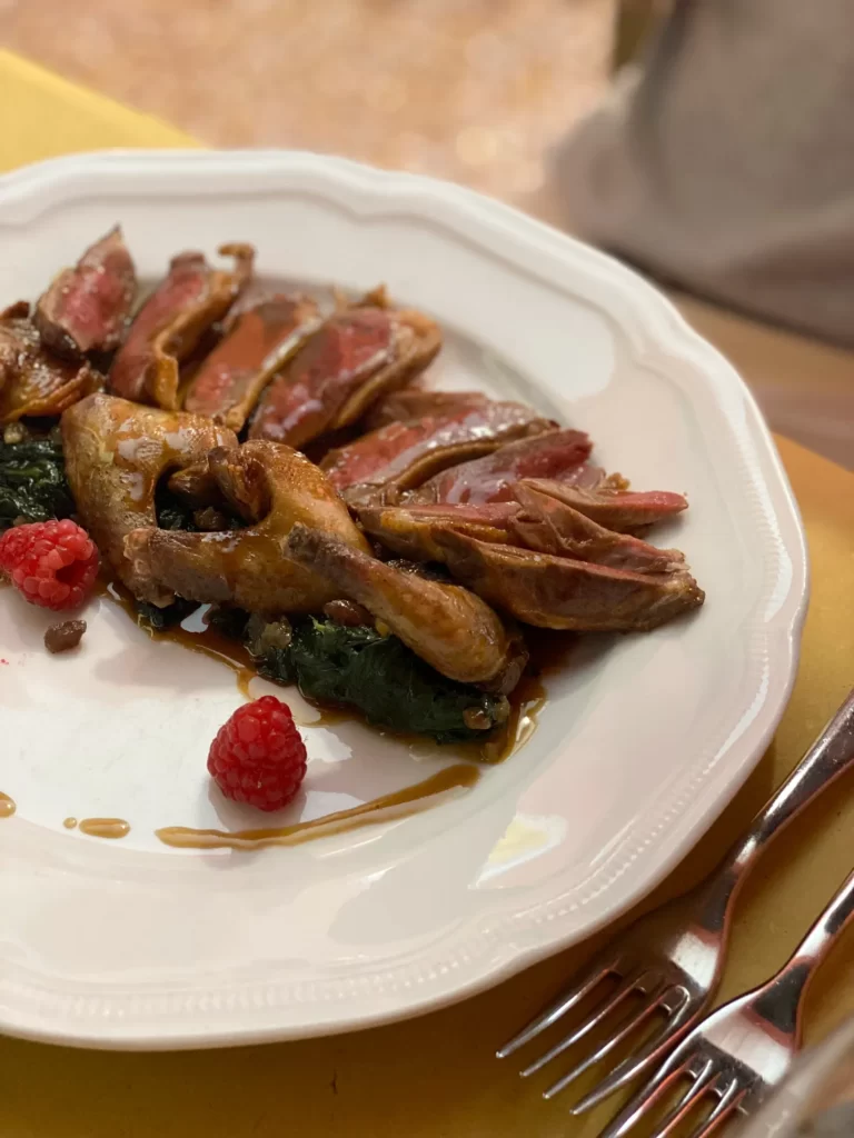 Here, the pigeon – perfectly pink – was served with sautéed spinach, some raspberries and a rich yet balanced gravy to tie it all together.